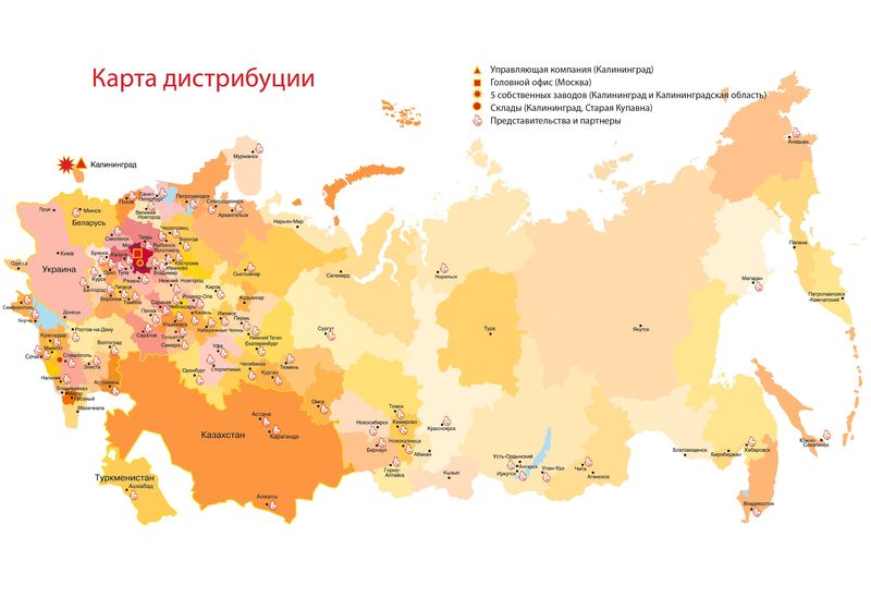 Продукция Группы компаний представлена в федеральных и региональных торговых сетях по всей России от Калининграда до Владивостока и в 16 странах СНГ и дальнего зарубежья благодаря развитой системе дистрибуции.