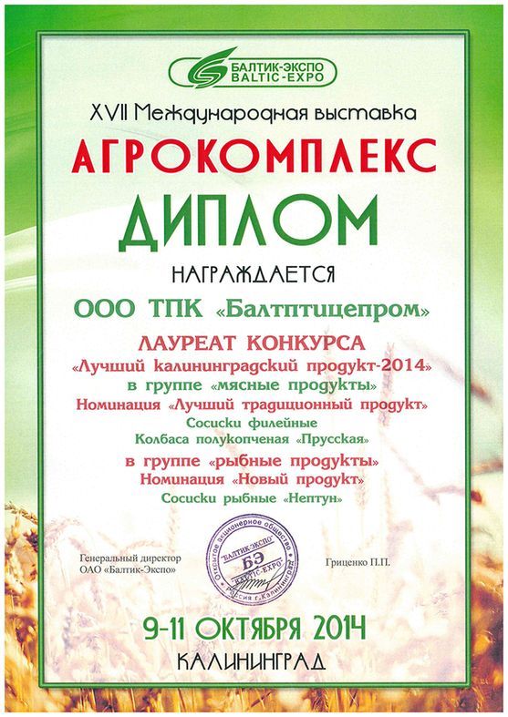 По итогам участия в выставке в ежегодном конкурсе «Лучший Калининградский продукт-2014» Группа компаний «Продукты Питания» была награждена дипломами: