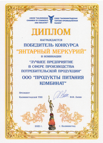 ООО «Продукты питания Комбинат» стал победителем конкурса «Янтарный меркурий» в номинации «Лучшее предприятие в сфере производства потребительской продукции».