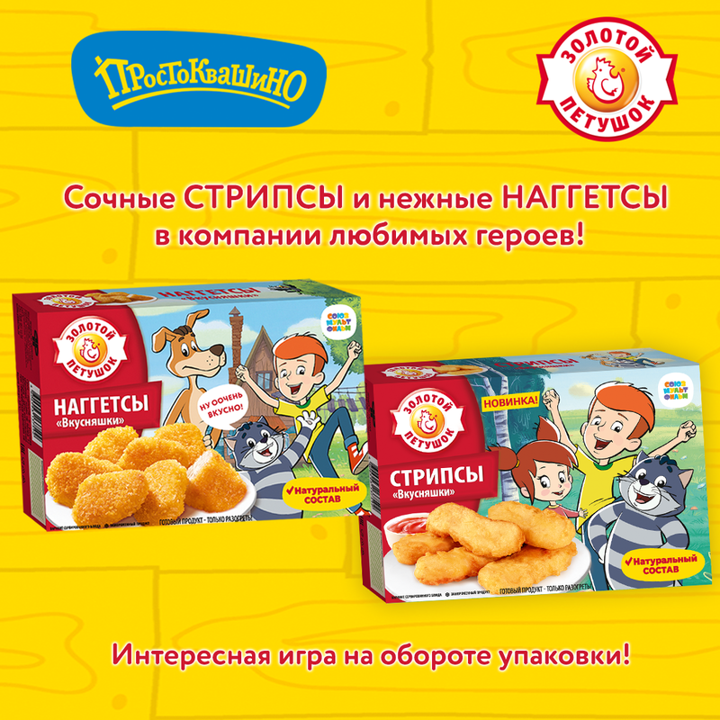 Хорошие новости! На полках уже появились не только Стрипсы, но Новые Наггетсы ВКУСНЯШКИ «Золотой Петушок» с героями мультфильма «Простоквашино» киностудии «Союзмульфильм»!